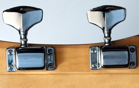The headstock reverse of a 1971 Epiphone 1820 bass. The closed gear tuners used on this bass appear on numerous Japanese instruments of the period. Note the angled metal keys. There seem to be several very similar variants of these, and many Matsumoku basses have very similar tuners with black plastic buttons.