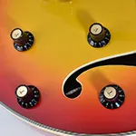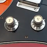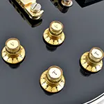 These plastic 'bell' control knobs were fitted to almost all electric guitars produced at the Matsumoku guitar factory, Matsumoto Japan from the mid/late 1960s to the mid 1970s. All were painted from the inside, with an (approx) 7mm clear section, and a gold metal reflector cap marked V (volume) or T (tone). It seems these knobs were solely used by Matsumoku, and are a very good indication of a Matsumoku-made guitar. Three colours exist: gold and silver (with black numbering) and black (with white numbering). Not to be confused with other similar looking vintage Japanese guitar knobs without the metal cap. more