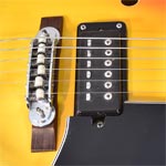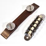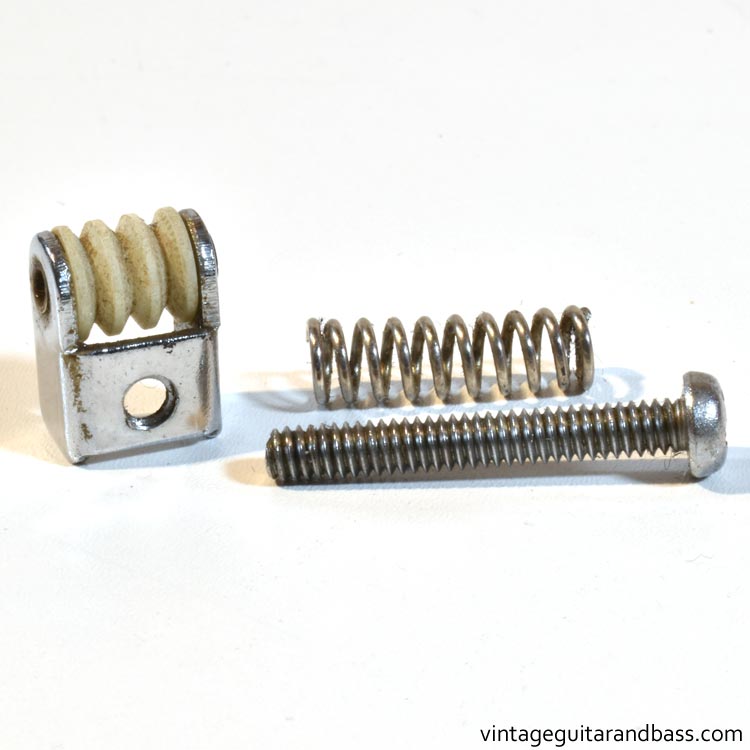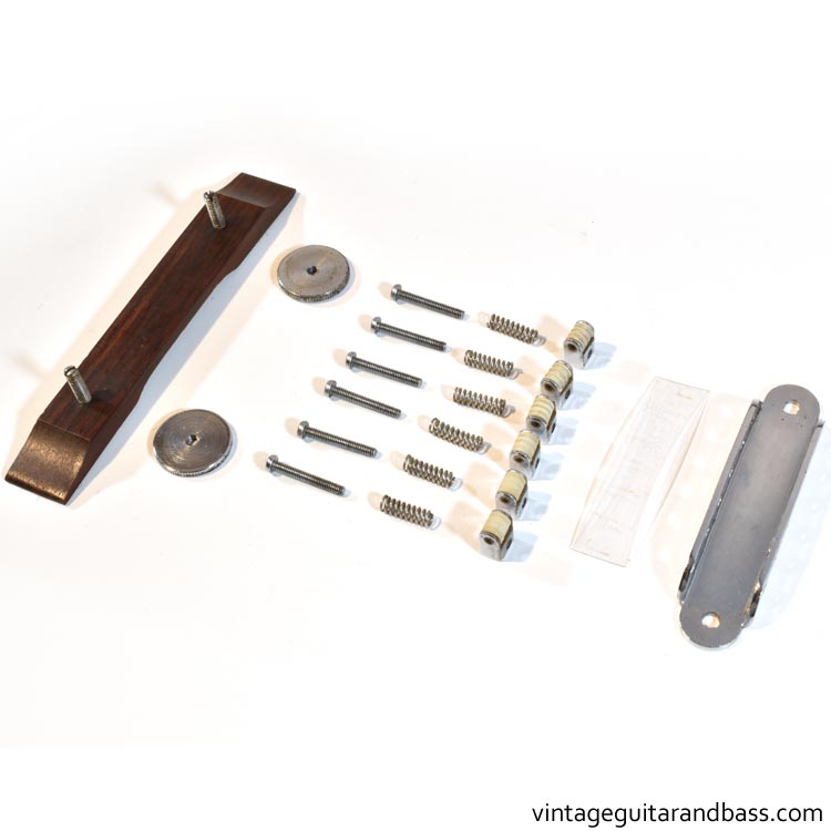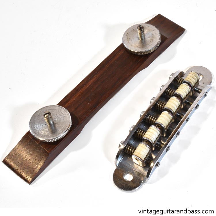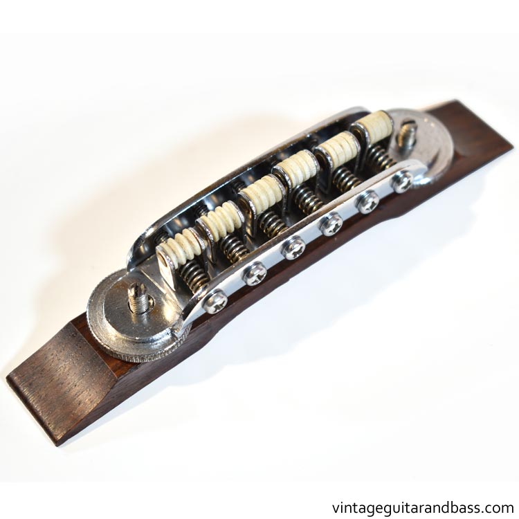 This floating bridge was fitted to wide range of electric acoustic guitars produced at the Matsumoku guitar factory, Matsumoto Japan; from the mid/late 1960s to the mid 1970s. This facility produced guitars for export around the world, and this bridge appeared on guitars branded: Angelica 2856, Aria (5002T, 5102T), Aria Diamond (1202T, 1302T), Commodore (N177 / N25), Conrad 1276, Conqueror, Domino (Dawson 40E2), Epiphone (5102T / EA-250), Greco 950, Lyle (5102T), Orlando, Pan P-D / P-T, Raven, Toledo, Stewart, Univox (HR-2 / Coily), Ventura (V-1000, V1001, V1002, V1400, V1500) - and most likely many, many more.
