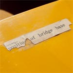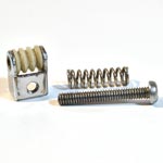 The bridge consists a 'tray' with individual intonatable saddles, over a rosewood base. Height is adjusted by two wheels, one at each end - 22mm diameter, 2.75mm thick. A thin, clear plastic strip sits beneath the saddles (presumably to reduce friction when adjusted) - dimensions 15mm x 64mm x 0.3mm (rough cut, ends not straight). The six saddles are each mounted on 21mm x 2.9mm cross head dome bolts.