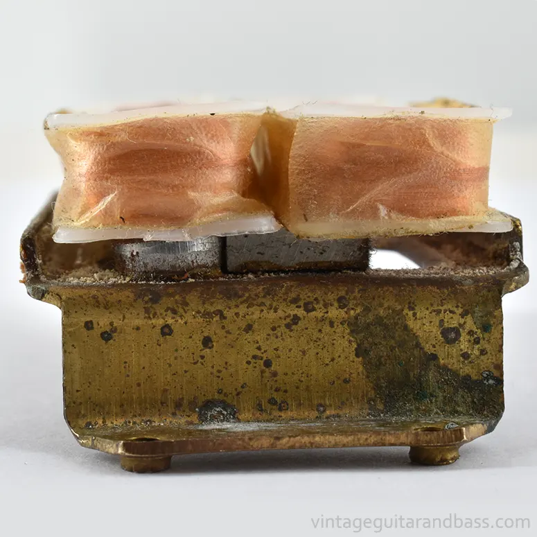 The gold-plating of the cover is still very strong on the underside of the cover. With this removed, the structure of the pickup is apparent: two side-by-side coils, with adjustable polepieces passing through one coil (on the left), and a non-adjustable 'crenellated' polepiece strip through the other.