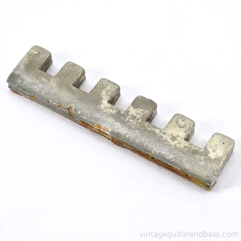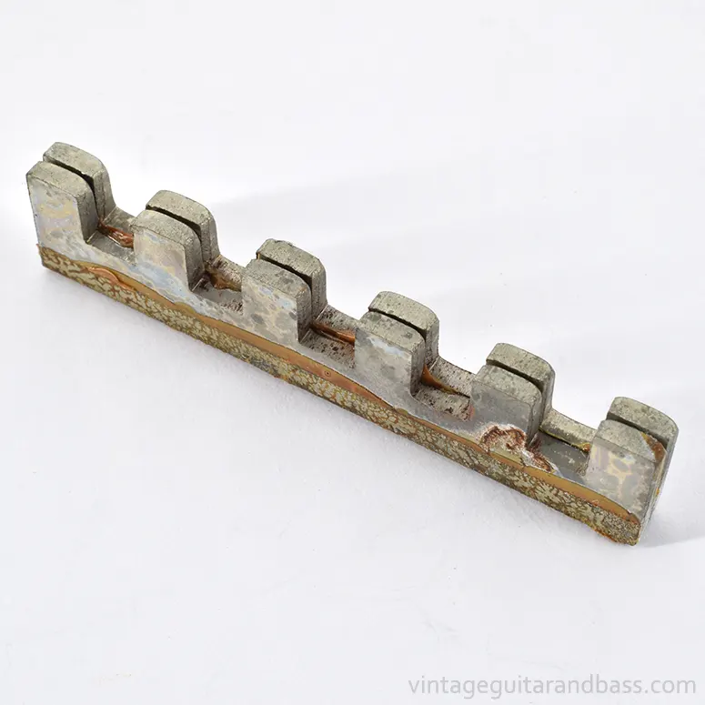 Polepieces were more narrowly spaced at the neck; 9.4mm, to just over 10.0mm at the bridge (for example this 1972 Jedson Jet). Although there are examples of guitars with two narrow spaced 'neck' pickups (for example this 1971 Shaftesbury 3400). and two wide spaced 'bridge' pickups (for example this 1973 Shaftesbury 3400). The broad construction of this pickup did not change, but some details did evolve, but there was an update in late 1972 or early 1973. The baseplate, formers (bobbins), magnet all appear to be unchanged (at least in dimensions), but the cover is 2mm taller, and the polepieces 3mm longer.