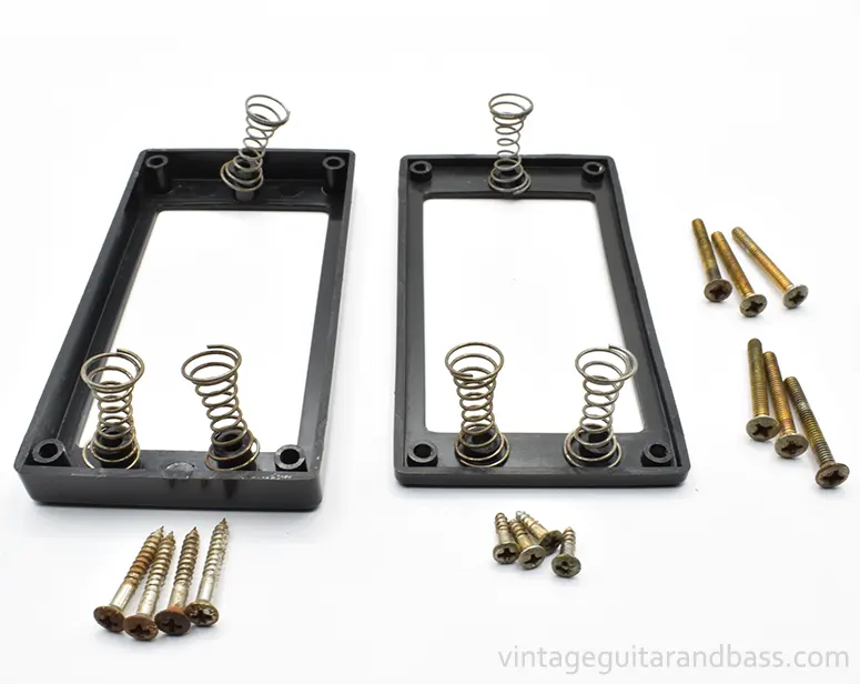 Matsumoku Maxon humbucker mounting rings, bolts, screws and springs. Three height adjustment bolts / pickup: 25mm oval cross head with pre-1967 Japanese standard M3 thread (pitch of 0.6mm). The plastic surrounds have approximate dimensions 94mm x 50mm with a cutout of 71mm x 40mm. Their heights vary somewhat, as the bottom edge is curved to match the arched top of the guitars body, but the neck pickup surround has a maximum height of 4.3mm, the bridge 9.3mm. The surrounds are held in place with four oval cross head screws sometimes 20mm, sometimes 15mm at the bridge; and 10mm at the neck.