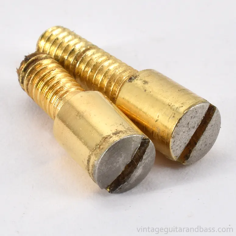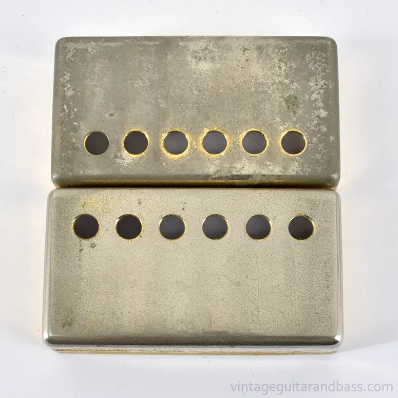 1971 (top) and 1973 (bottom) Maxon humbucker covers. Note the differing pole piece spacing: 9.4mm for the bridge pickup (1971 Shaftesbury) a shade over 10mm for the neck (1973 Shaftesbury).