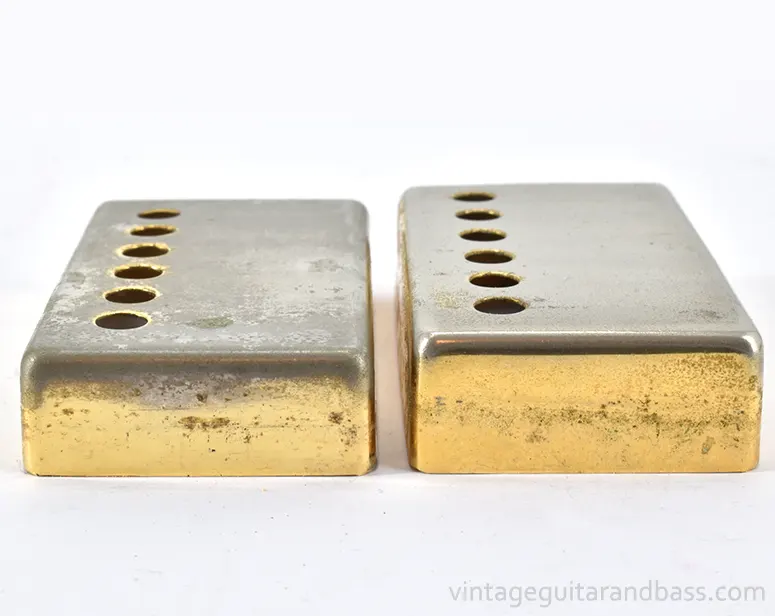 1971 (left) and 1973 (right) Maxon humbucker covers. Note the differing heights: 14mm for the 1971, and 16mm for the 1973. Both covers are 70mm long x 39mm wide.