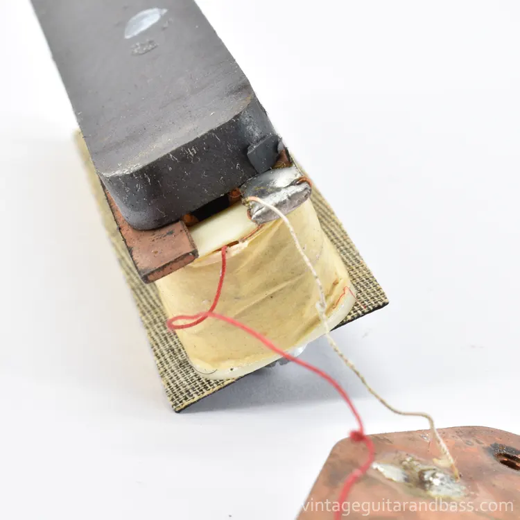 This end-on view shows the wires leaving the coil: the white attached to the baseplate, the red connecting to the guitar's controls, via the terminal riveted to the underside of the baseplate.