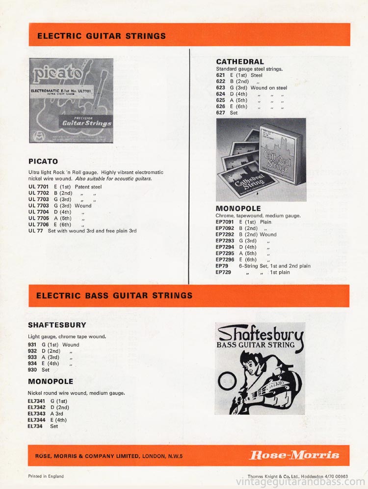 Continuing from the previous page, the back cover of this catalog shows strings available from Rose Morris in 1970: Picato, Cathedral, Shaftesbury and Monopole.