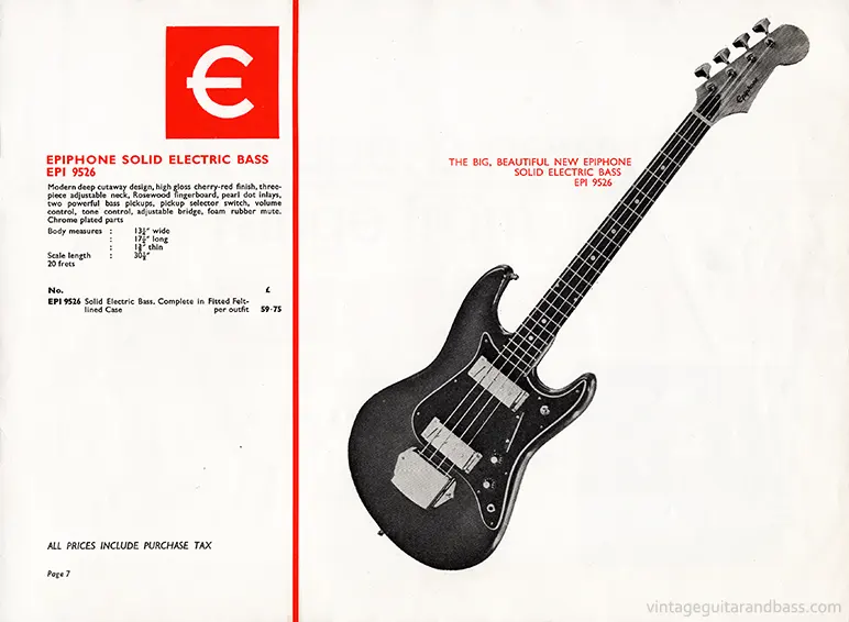Epiphone solid electric bass, model EPI 9526 making it's first catalog appearance. Note the single sided Fender-style headstock - a feature of only the very earliest basses from mid-late 1970, and rarely seen in Epiphone publicity (this seems to be the only example?). This bass was initially known in the USA as the Epiphone 1820 - from mid 1972 it was given the name most people know it by: Epiphone ET-280).