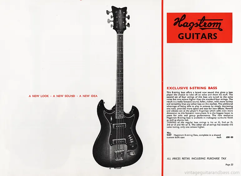 This 8-string bass offers a brand-new sound that gives a bass player the chance to take off on solos and show his stuff. The second set of four strings of this bass are tuned to the same notes but are one octave higher than the standard four strings. The result is a really fantastic sound, fuller, richer, with more variety and versatility than any other bass on the market. The additional advanced of being able to play in octaves by simply depressing one note, provides more speed and ease for new effects. Reverb and vibrato are at the player's fingertips which adds even more dimension to this fantastic instrument. It is the biggest boost in years for solo and group performance. The new exclusive Hagstrom 8-string bass is available in mahogany sunburst finish as well as cherry red.
