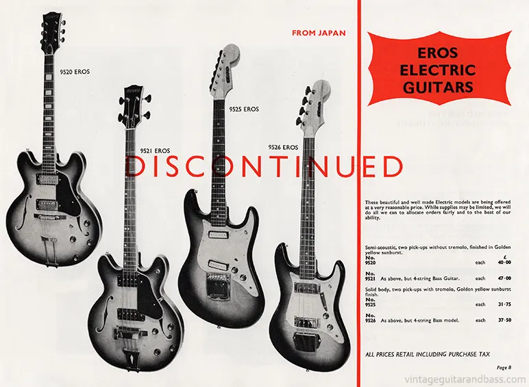 1971 prices for these guitars were as follows: Eros 9520 semi acoustic £40, 9521 semi acoustic bass £47, Eros 9525 solid body electric £31.75, 9526 solid body bass £37.50.