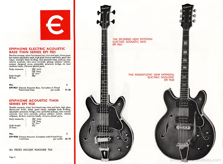The 1971 list prices for these guitars are unchanged from 1970 and are as follows: Epiphone 9520 £62.25; Epiphone 69521 bass £71.25.