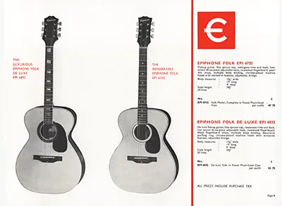 This 1971 Rosetti (UK) Epiphone brochure was the second to promote the new line of Japanese Matsumoku built guitars, and in may ways it is just an updated version of the previous printing from mid-late 1970. In fact the cover and pages 2 and 3 are identical to the previous printing and the brochure still fits into eight pages, though more models are condensed onto fewer pages. Page 4 introduces two new models: both smaller-bodied folk acoustics, the Epiphone 6732 and 6832.
