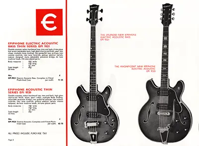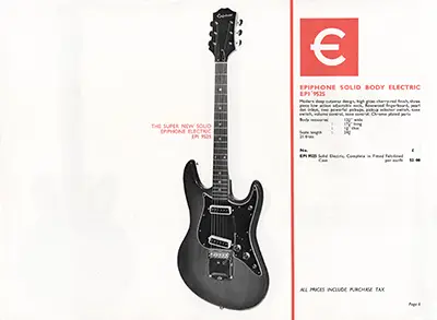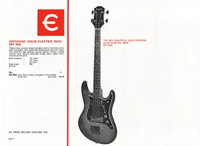 But perhaps the most interesting change relates to the new images of the 9525 solid body guitar and 9526 solid body bass, shown on pages 6 and 7. The text is identical to that of the previous catalogue, however the images show these instruments as many people will be most familiar with them: i.e. with a two-sided Epiphone-style headstock, rather than the Fender-style (or Aria 1802T-style) headstock shown in the earlier 1970 version.