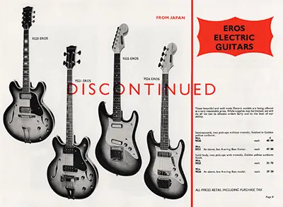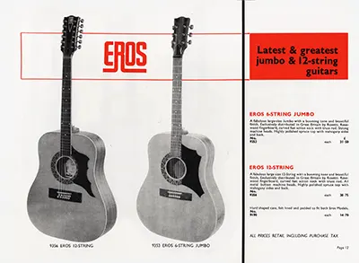 Rosetti sold a number of re-badged guitars with the brand Eros (most likely a reference to the famous statue in Piccadilly Circus, London), including Matsumoku electrics from Japan - page 8 and Eko acoustics from Italy page 12.
