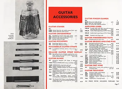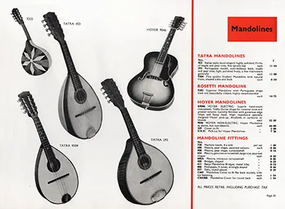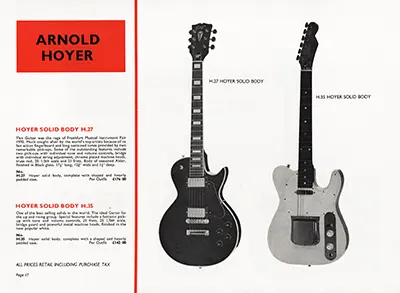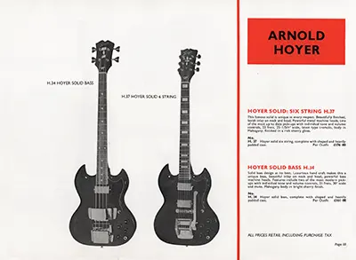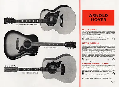 This catalogue has three pages of guitars by German maker Arnold Hoyer: three Jumbo acoustics; and Les Paul, Telecaster and SG-styled solid bodies. Pages 16 to 18.