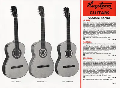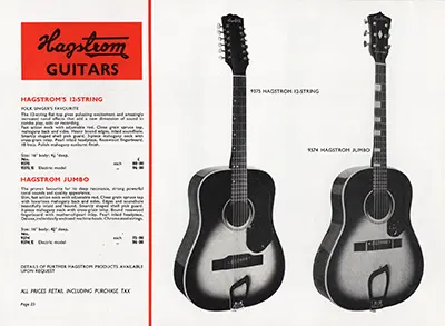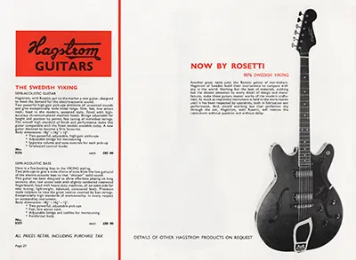 Another great name joins the Rosetti galaxy of star-makers. Hagstrom of Sweden build their instruments to compare with any in the world. Nothing but the best of materials, nothing but the closest attention to every detail of design and manufacturer, make these guitars master works of the modern craftsman. So much so that every instrument is held in the work-rooms until it has been inspected by specialists, both in fabrication and performance. And, should anything less than perfection slip through the net, Hagstrom, with Rosetti, will restore the instrument without question and without delay.