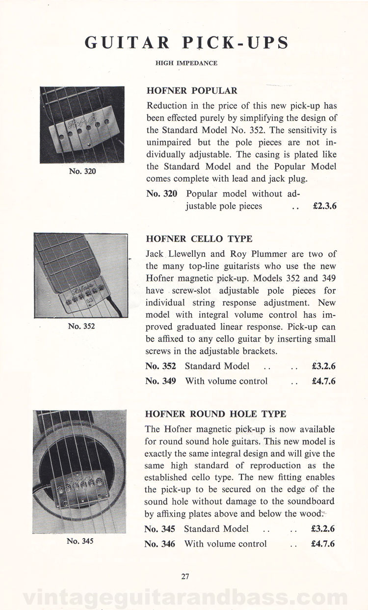 Selmer 1960 Hofner and Futurama catalogue, page 27. Hofner produced several pickups, with simple circuitry that could be easily fitted to an acoustic guitar; the Hofner popular, cello type, and round hole. These were widely used in the early 1960s.