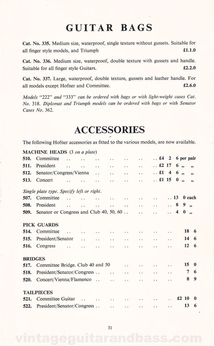 Selmer 1960 Hofner and Futurama catalogue, page 31. Guitar bags and Hofner spare parts. The Hofner parts listed include machine heads, pickguards, bridges and tailpieces.