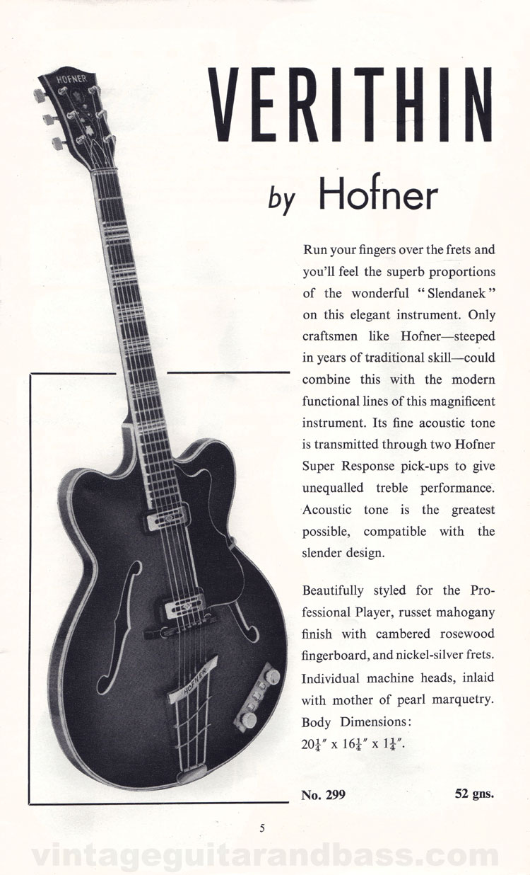 The Verithin was a new model for 1960 and this is it's first catalogue inclusion; all were fitted with the latest Hofner innovations highlighted in this catalogue: adjustable truss rod and "Slender-nek". Pickups were the same "Super Response" or "toaster" single coil units fitted to the rest of the Hofner range at this time.