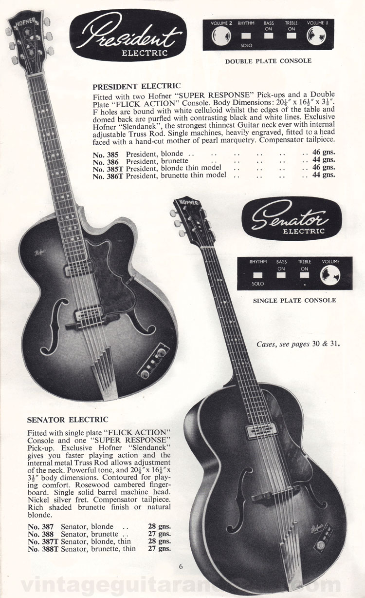 1960 UK prices - Hofner President: blonde finish 46 gns.; brunette finish 44 gns. Hofner Senator: blonde finish 28 gns.; brunette finish 27 gns.