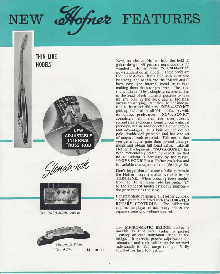 Selmer 1964 catalogue. Page 2. The majority of the 32 pages of this catalog feature Hofner guitars, and this first one explains some of the new Hofner features that they were then promoting: thinline bodies, Nova-Sonic (Hofner 511, or 'staple') pickups , Slenda Nek with adjustable truss rod and the micro-matic bridge.