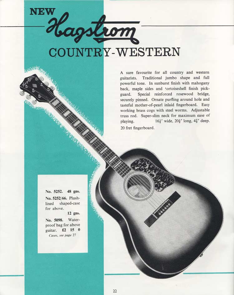 Selmer 1964 Hofner and Futurama catalog, page 22. Details of the Hagstrom H45 Country-Western flat top acoustic guitar