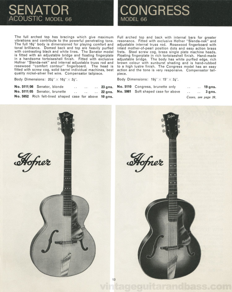 1965/66 Selmer "Guitars and Accessories" catalog, page 13: Hofner Senator and Congress Acoustics