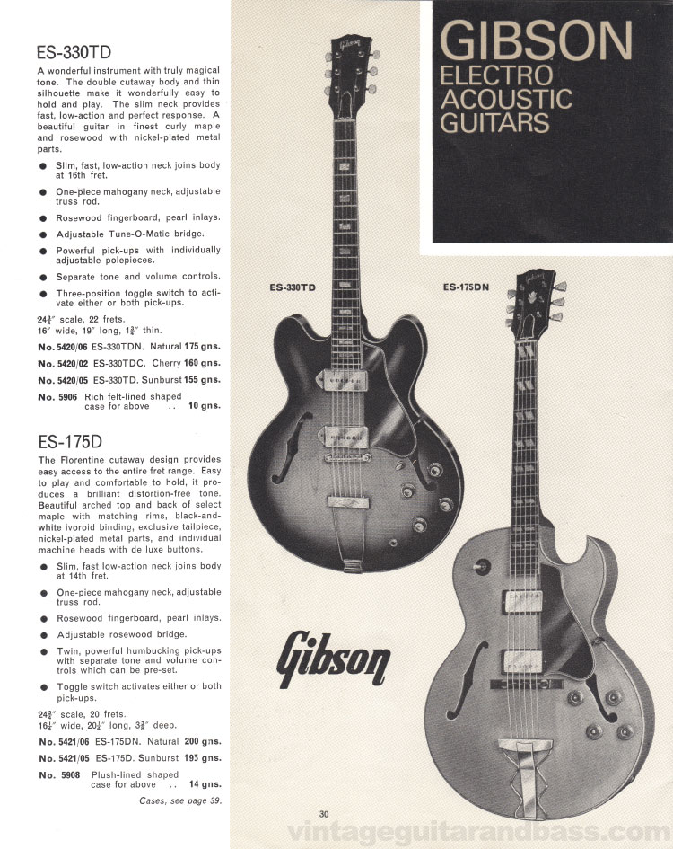 This page details two Gibson electric acoustic guitars available in 1966: the thinline ES330TD and the full bodied ES175D jazz guitar. These two guitars are shown together in the 1963/1964 Selmer catalog, with the same image used for the ES-175; however the ES-330 is now updated to show a guitar with block rather than dot neck inlays.