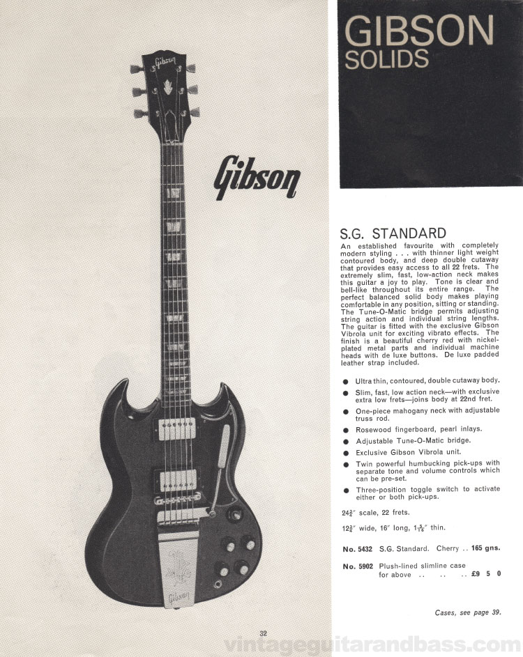 The SG Standard was certainly a fine model fitted with Gibson's famous PAF humbuckers, lyre tailpiece, inlaid headstock and block position markers. The even higher end (gold hardware, three-pickup) Custom is not included in this catalog.