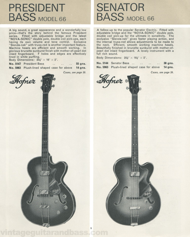 These were Hofner's lowest-priced basses, and in fact, the Senator is the cheapest semi-acoustic bass in the whole catalogue; only the solid body Futurama bass De Luxe (see page 23) is cheaper.