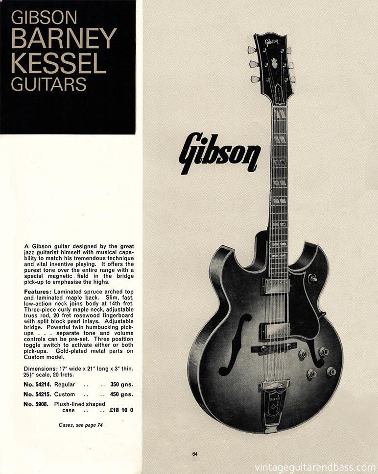 UK Gibson distributor Selmer first included the Gibson Barney Kessel Regular and Custom in their 1965/1966, and the page here uses the same image and description as used back then. The models were actually listed in US catalogs much earlier, first appearing in the 1962 Gibson guitars and amplifiers catalog.