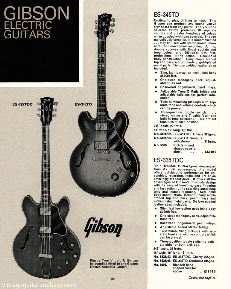Two mainstays of the Gibson line in 1968 (and today!), the Gibson ES-335TD and ES-345TD. The image of the 345 was the same one Selmer had been using since August 1963 (see the 1963/1964 Selmer catalog), however the 335 image is updated to show the Cherry finish rather than sunburst (although in black and white!), block inlays rather than dot, and the trapeze tailpiece rather than a stop tailpiece.