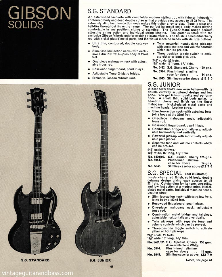 This page starts the Gibson solid body section, describing three SG models, the SG Standard, SG Special (not pictured) and the SG Junior. The SG Standard image had been used previously in the 1965/1966 Selmer catalog, whilst the SG Junior image is of quite an early example, first used in the 1963/1964 catalog. By 1968, new SG Juniors (and Specials) were visually quite different with larger pickguards and a Maestro vibrola tailpiece - of course Selmer may still have had older instruments in stock.