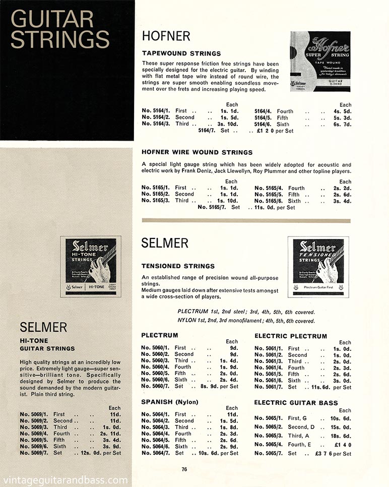 1968 Selmer "Guitars and Accessories" catalog, page 76: Hofner and Selmer strings