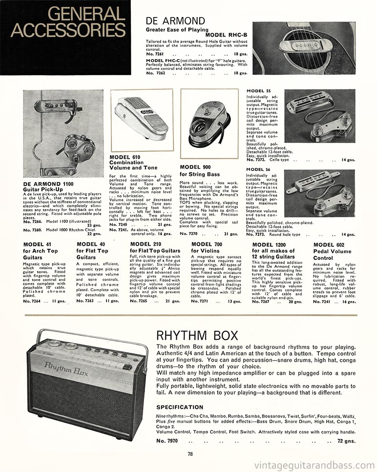 1968 Selmer "Guitars and Accessories" catalog, page 78: De Armond pickups