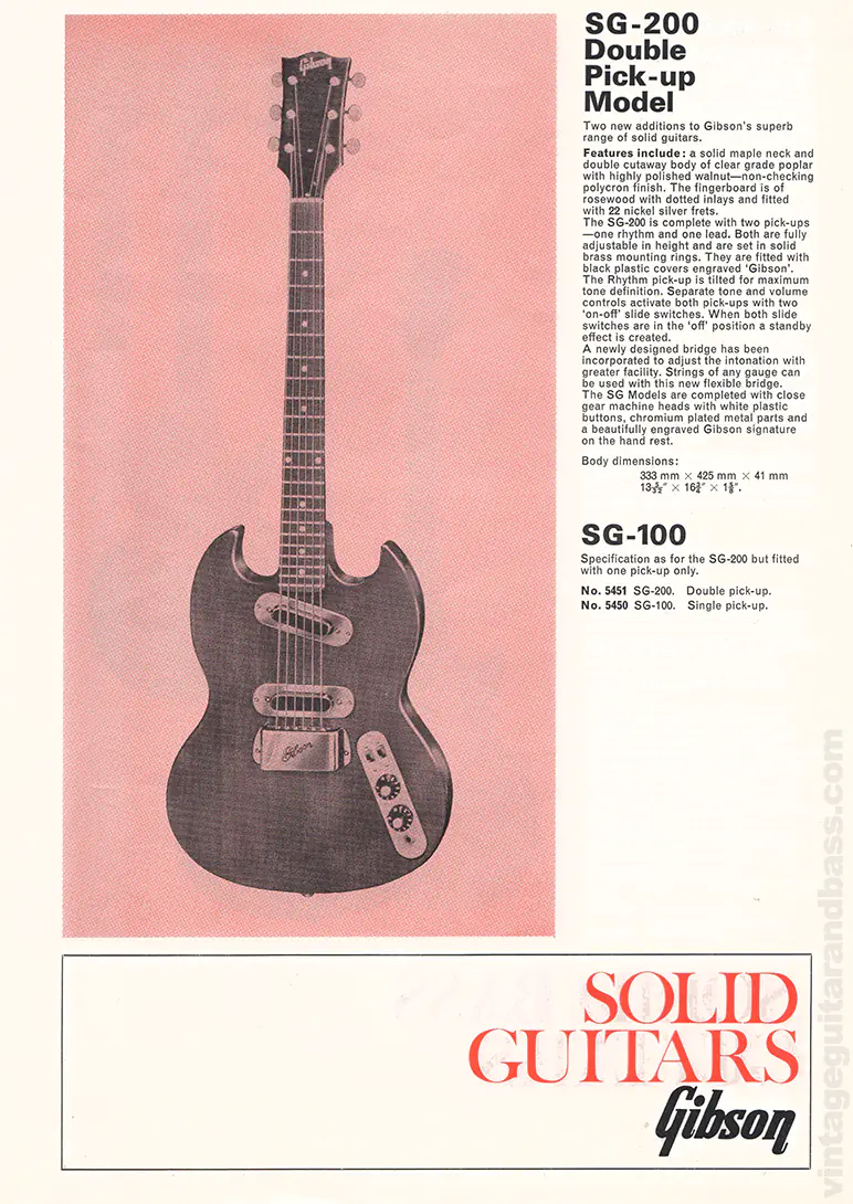 The Gibson SG-100 and SG-200 (shown here) were briefly produced and available from mid-1971. The SG-200 is not pictured in equivalent US literature of the time, making this its sole catalogue appearance. These were very similar guitars, with the SG-200 having two pickups and the SG-100 just one.
