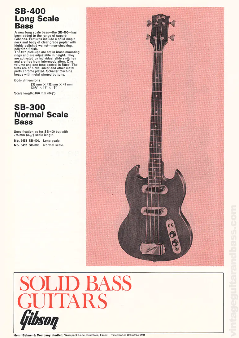 1971 UK prices are shown below. Although these models differed in scale length (30 1/2" for the SB-300, 34 1/2" for the SB-400), they were otherwise identical, so equipped with the same hardware/ number of pickups etc, and are therefore both listed at the same price.