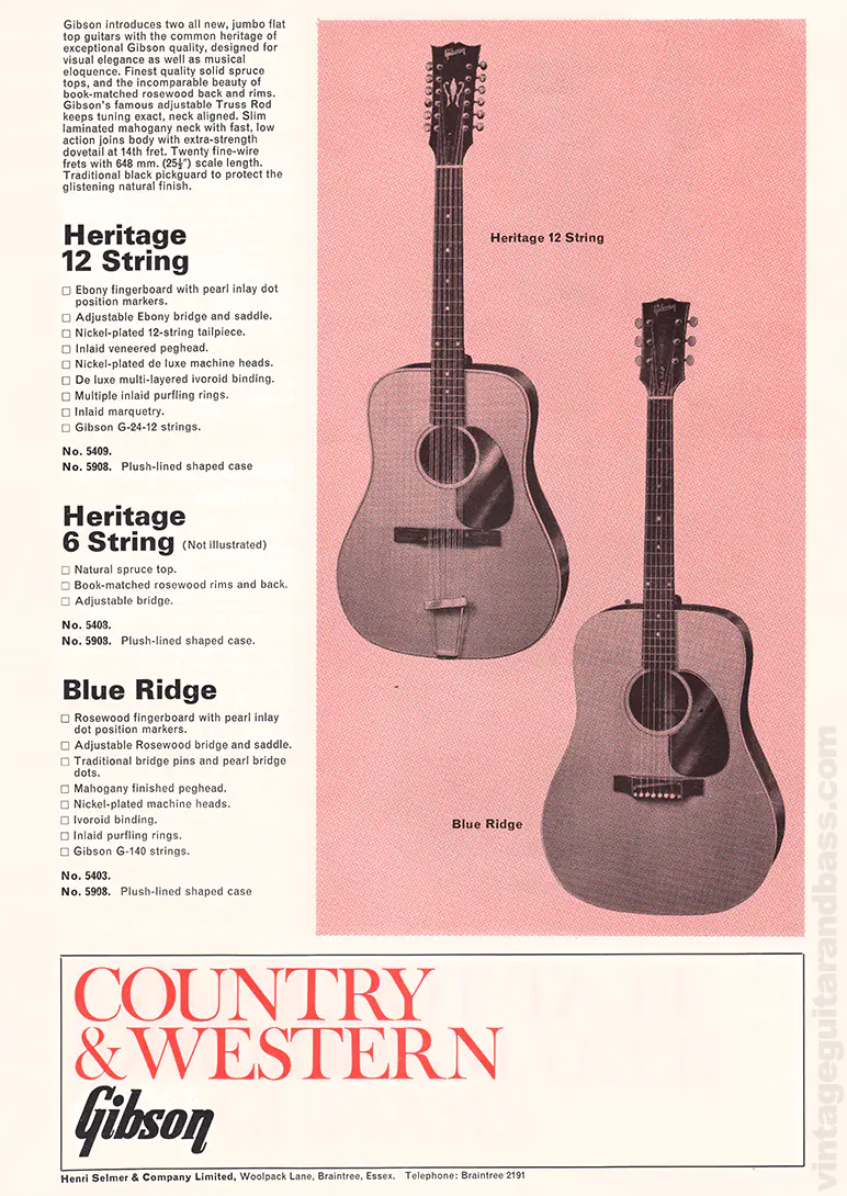 Page 15 shows three Country and Western Jumbo models, the Gibson Heritage 6 and 12 strings, and the Gibson Blue Ridge.