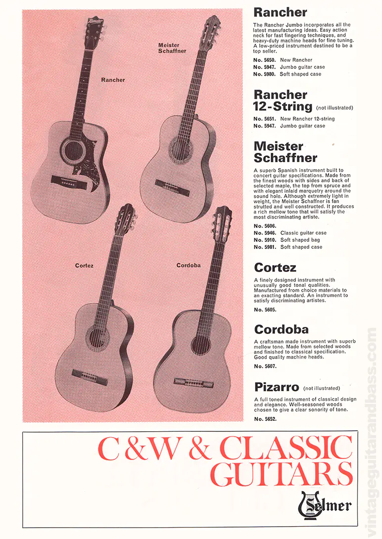 Catalogue page featuring a number of entry level Country & Western Classic guitars: The Rancher, Rancher 12-string, Meister Schaffner, Cortez, Cordoba and Pizarro. Three of these models were no longer listed in August 1971 price lists, being replaced by the new Yamaha guitars shown from page 20.