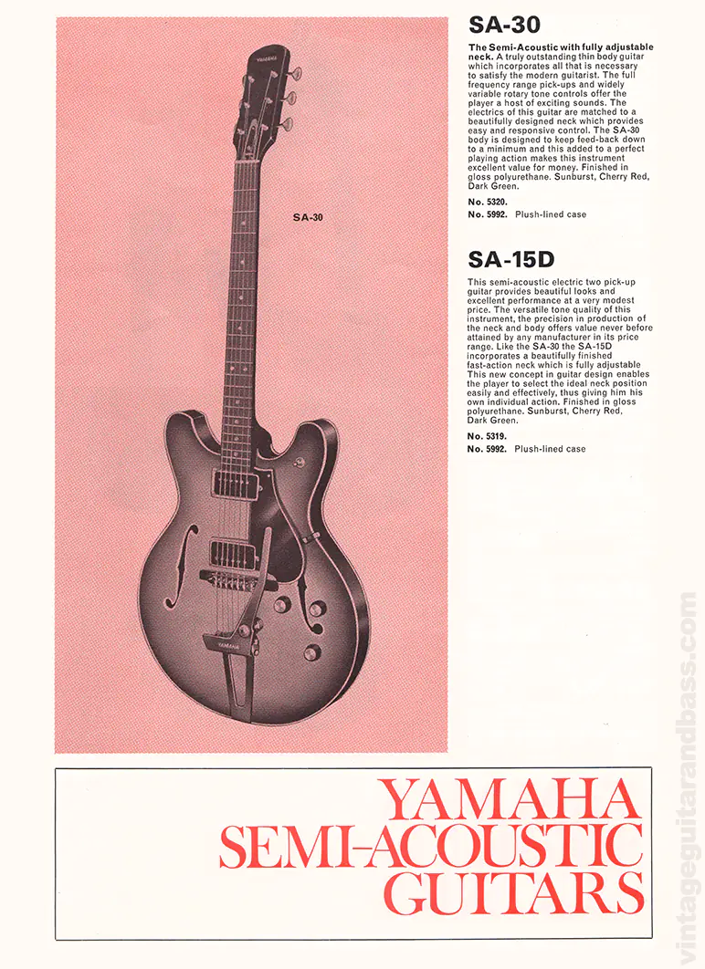 This page details two Yamaha semi-acoustic guitar models, the SA-30 (pictured) and the SA-15D. Yamaha guitars were a relatively new addition to the Selmer line, first included in Selmer literature since the 1969 Selmer catalogue.