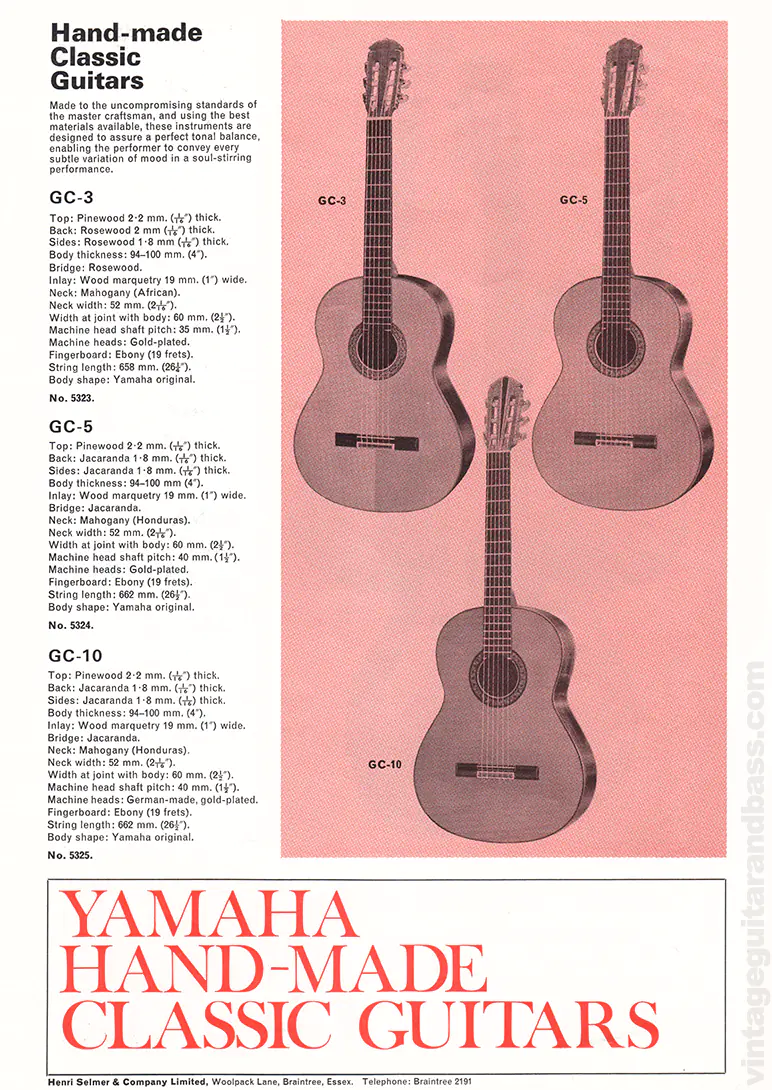 This page describes three beautifully constructed Yamaha guitars - all hand-made out of choice woods: a pine top, either jacaranda or rosewood back and sides. All have a mahogany neck with ebony fretboard, and gold-plated hardware. Unusually, this page goes into extraordinary detail of the specifications, including wood thickness of the top back and sides. These truly were nice guitars!