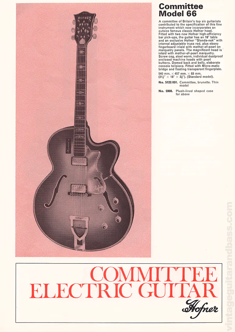 The Committee was one of the finest Hofner electric-acoustic guitars available from Selmer throughout the 1960s, available in both full-body and thinline body styles from 1959. But towards the end of the decade large body electric acoustics were loosing ground to solid bodies, and the model was slowly being phased out. The August 1969 Selmer price list included all Committee variants but the accompanying catalogue (for the first time) excluded the model entirely. This 1971 catalogue, however, does include one Committee again, for the very last time, but with just one variant listed: the thin body Committee with Brunette finish, model code 5123/051. The accompanying price list (August 1971) includes only the full-body version 5123/05 - presumably in error, although both thin and deep models had typically been priced identically, so perhaps of little significance.
