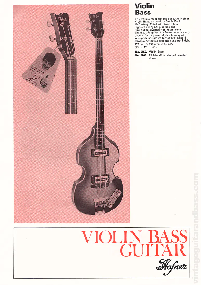 The Hofner 500/1 violin bass is probably the best known of all Hofner guitars, thanks to Beatle Paul McCartney who used several of these bases throughout his career. The hang-tag image shown here had been included in Selmer catalogues, unchanged, from as early as September 1964; but by 1971 McCartney was no longer the fresh-faced mop-topped Beatle on the image, and in fact the Beatles had actually split up as a group. But no mind, the Violin bass remained popular, and remained in Selmer price lists until at least September 1973.
