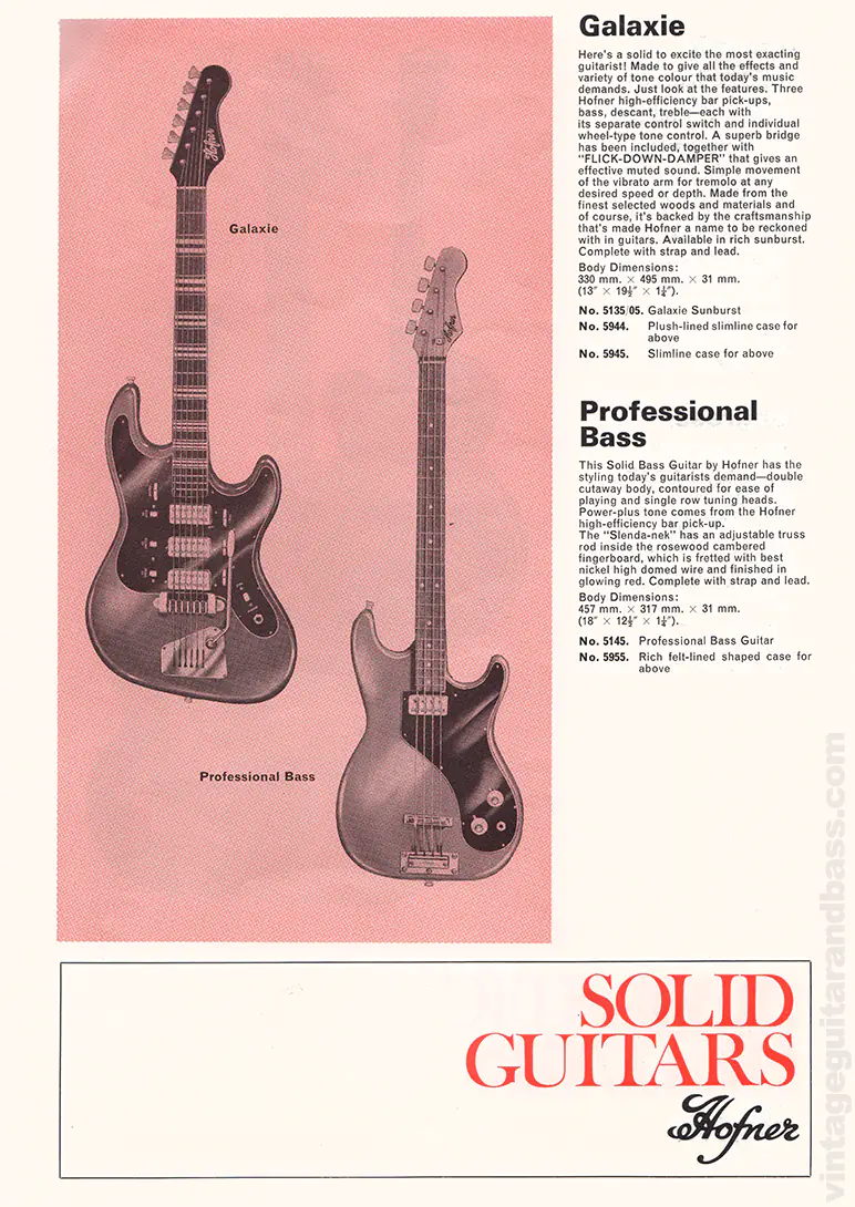 Page 34 details two solid bodies, the Hofner Galaxie six string guitar and (making it's last catalogue appearance) the Hofner Professional bass.