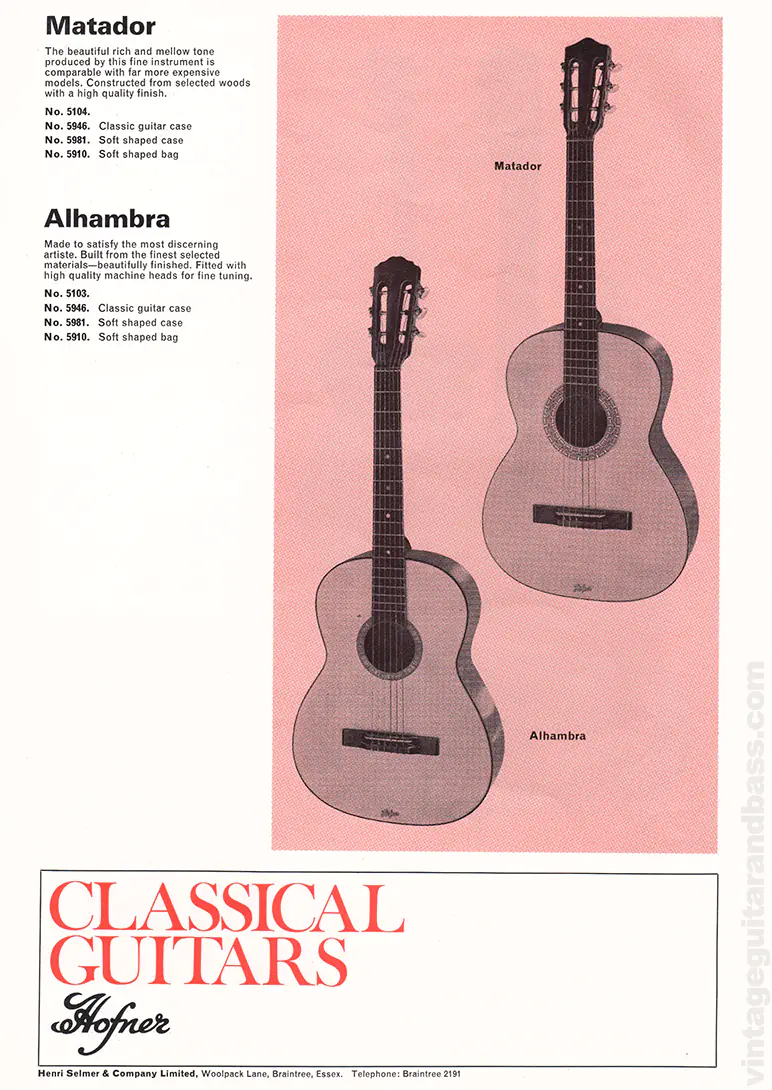 The suggested cases for the Hofner Alhambra and Matador acoustic was Futurama case 5946 or soft-case 5981 (see cases, page 44).