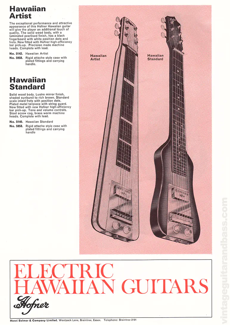 The suggested case for the Hofner Hawaiian guitars was "rigid attache style case" 5958 (see cases, page 44).