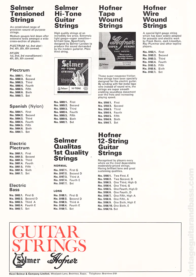 Selmer and Hofner strings: Selmer Tensioned Strings (Plectrum, Spanish, Electric Plectrum, Electric Bass), Selmer Hi-Tone, Selmer Qualitas, Hofner Tape Wound, Hofner 12-String, Hofner Wire Wound.