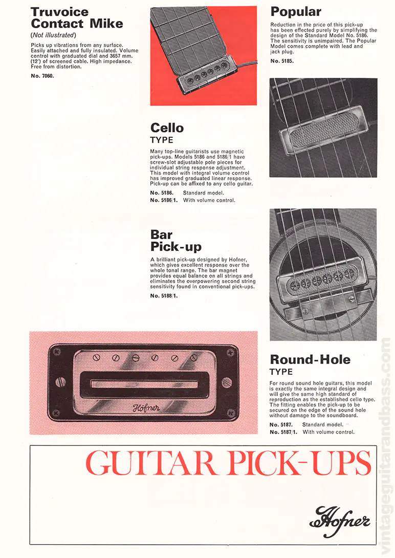 Page 49 shows a number of Hofner pickups including the Hofner 513 bar pickup fitted to the majority of electric models since 1967. Also shown are a number of aftermarket pickups designed to electrify acoustic guitars: Popular, Cello (with pole pieces) - for mounting to the body-end of an acoustic archtop guitar's neck; and Round Hole for flat top and jumbo acoustics with a soundhole.