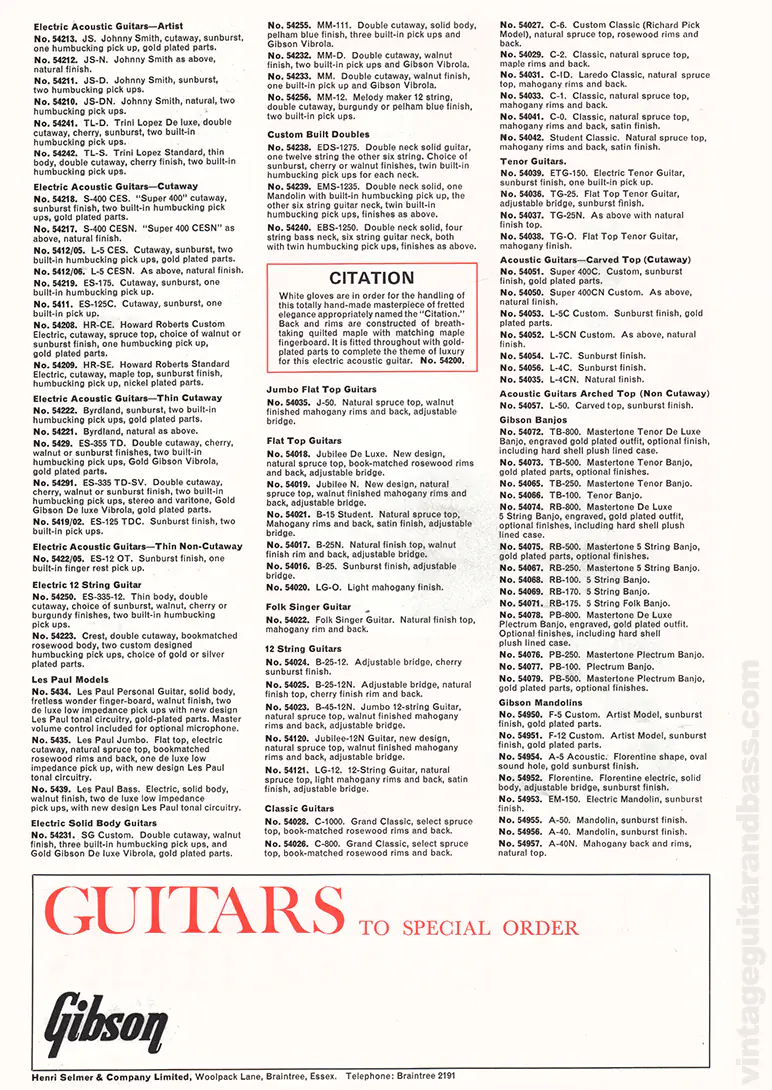Only a portion of Gibson instruments are listed within the pages of this catalog, though the entire Gibson line was available by special order. Although Gibson listed numerous models in the USA as custom order only, these were typically high end (e.g. the extremely fine Gibson Citation) or with very small production runs (e.g. Gibson doublenecks). And whilst this Selmer catalogue does include these as special order instruments, also included are 'bread and butter' guitars like the single pickup Gibson Melody Maker and the LG-0 acoustic.