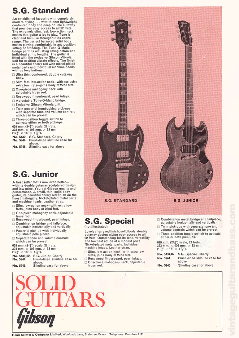 Selmer catalogues for the rest of the 1970s were significantly improved, and the 1972 Selmer catalogue shows the entire Gibson range accurately and in full colour. The SG Junior was described as follows: